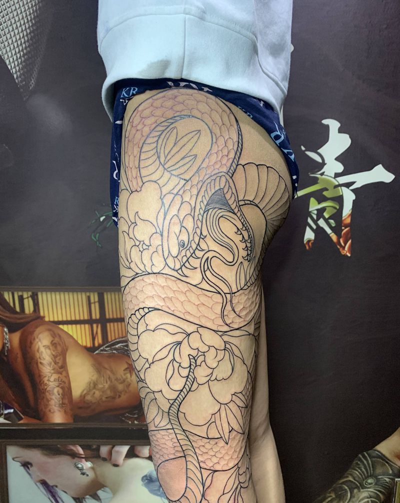 • T网红王老大花腿龙纹身图片_腿部新传统纹身图案