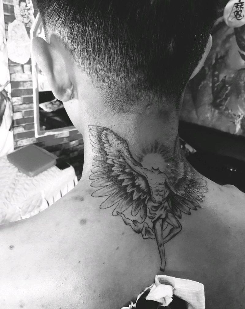 坠落天使纹身图片_颈部欧美写实纹身图案