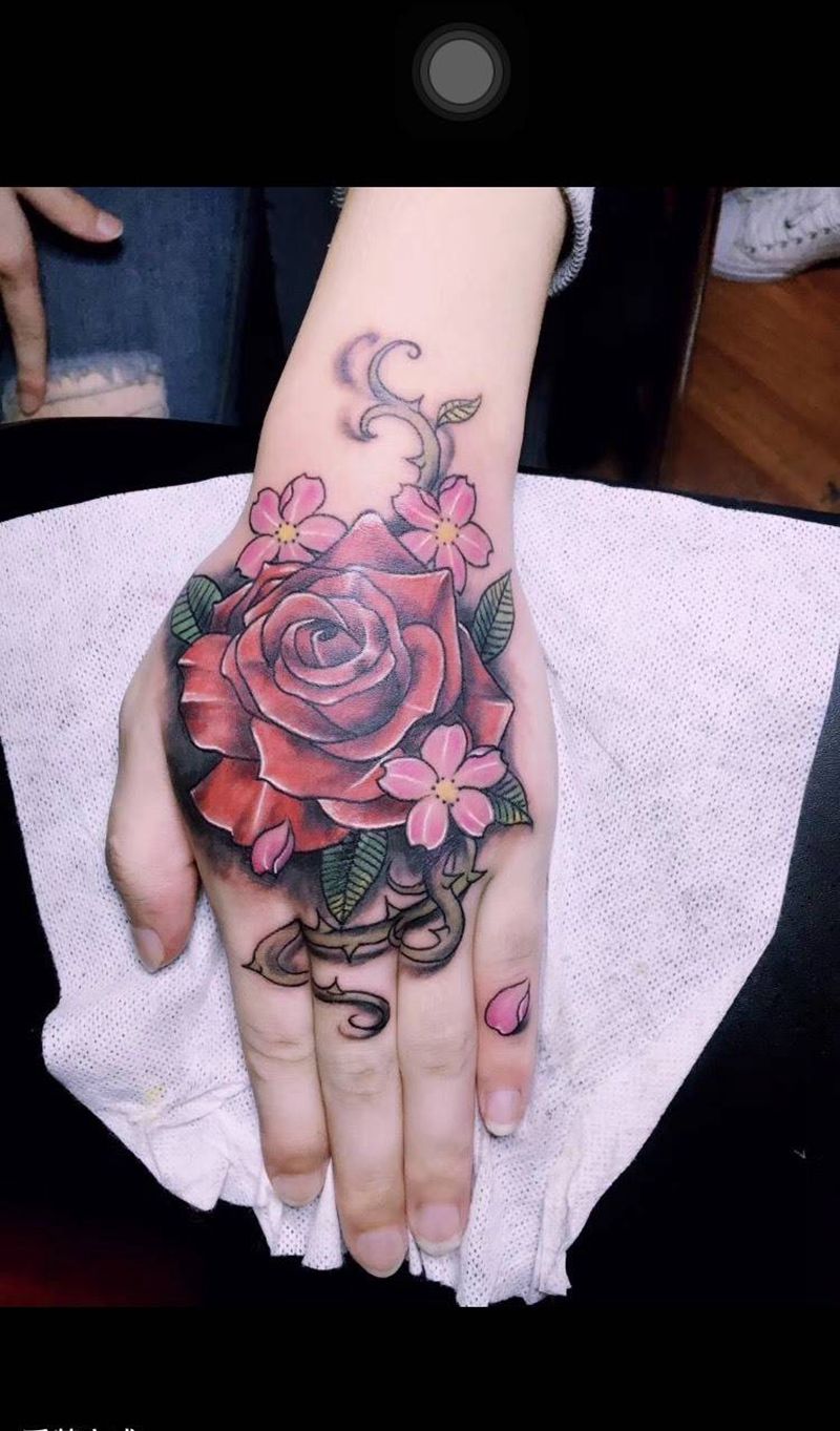 • 手背潮流时尚的玫瑰花眼睛纹身图案