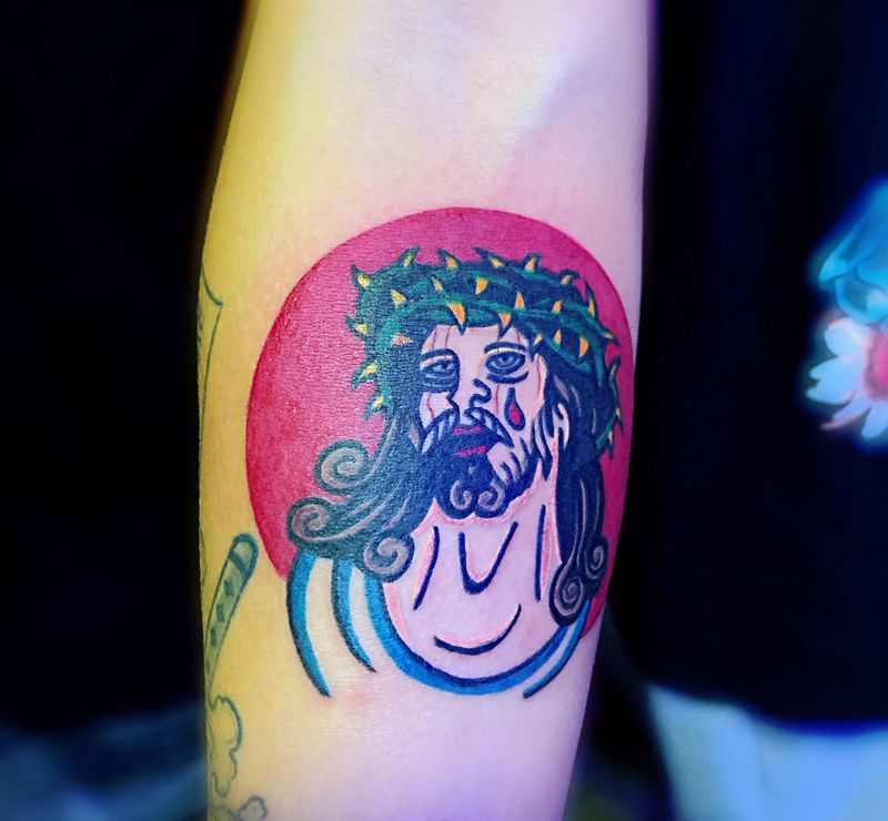 当前位置: 首页 >四川省乐山市纹身店-蛊彫刺青铺纹身图案>Old school耶稣纹身图片_手臂Old School纹身图案