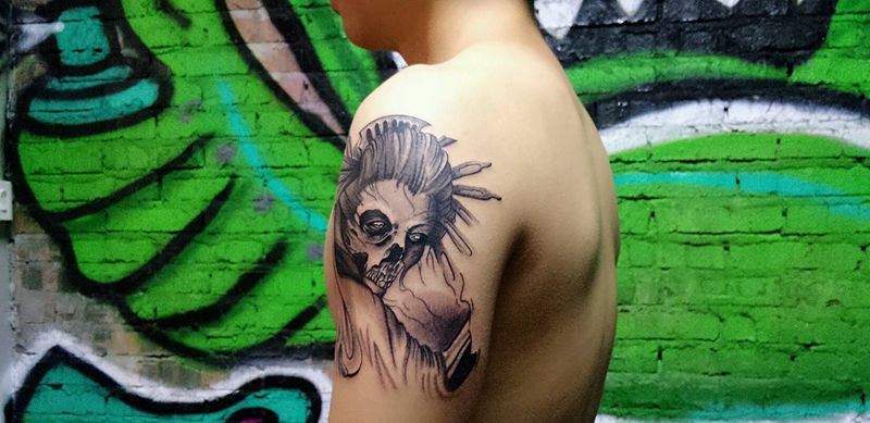 当前位置: 首页 >四川省乐山市纹身店-蛊彫刺青铺纹身图案>骷髅艺姬纹身图片