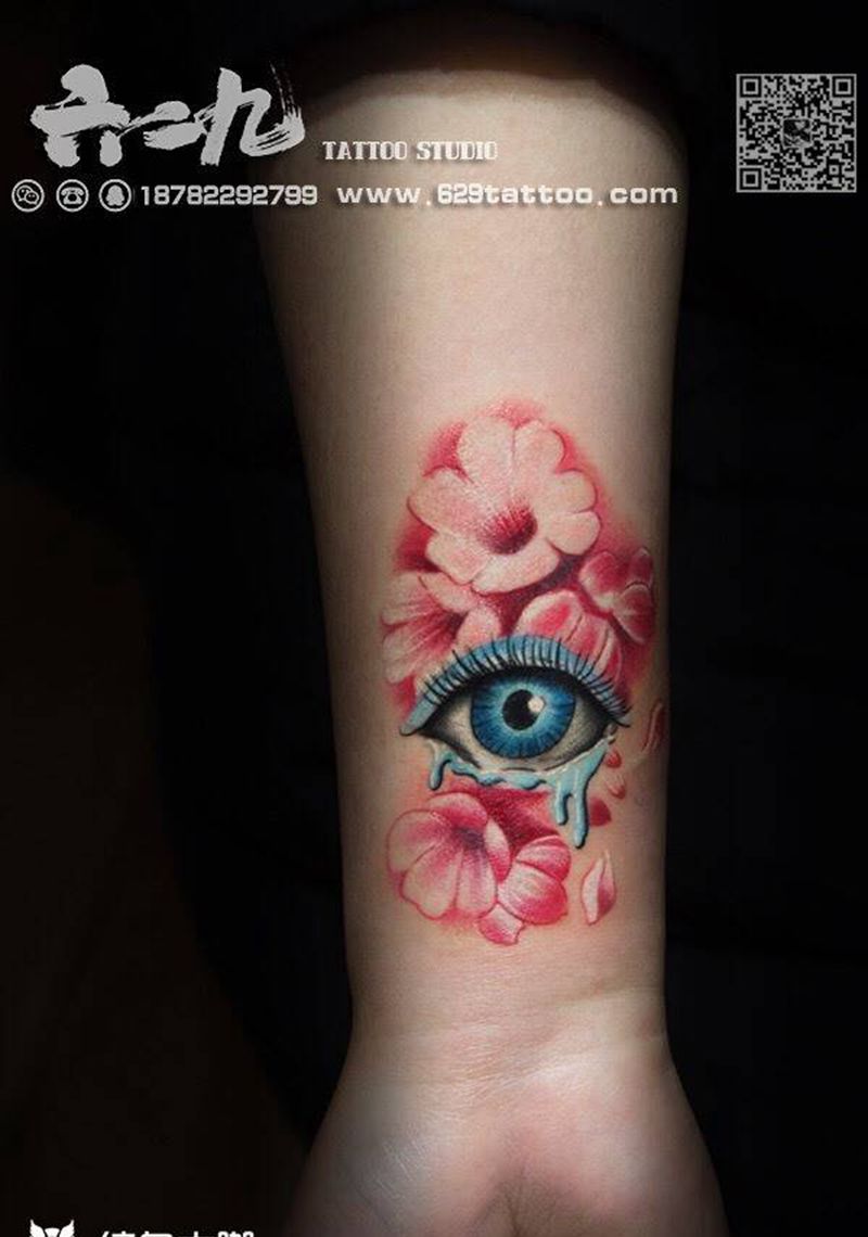 • 手背潮流时尚的玫瑰花眼睛纹身图案