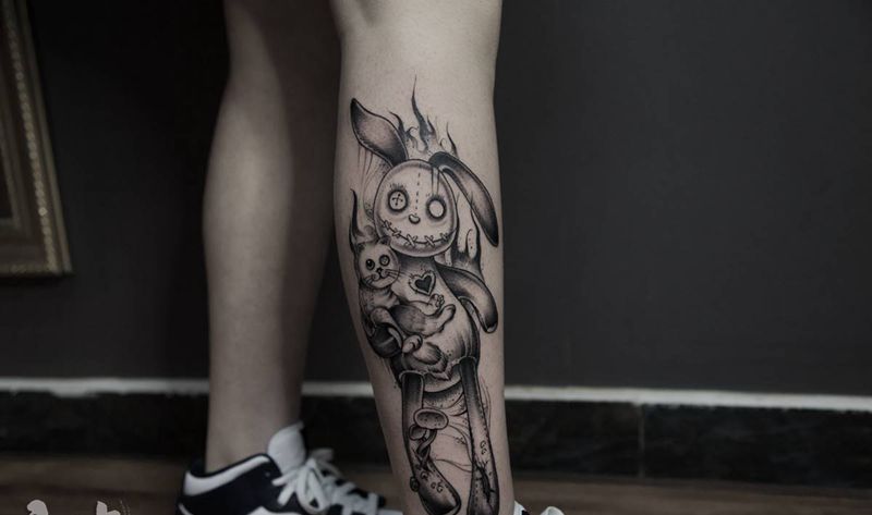 • T包小腿吹火男+阿多福纹身图片_腿部老传统新传统吹火男阿