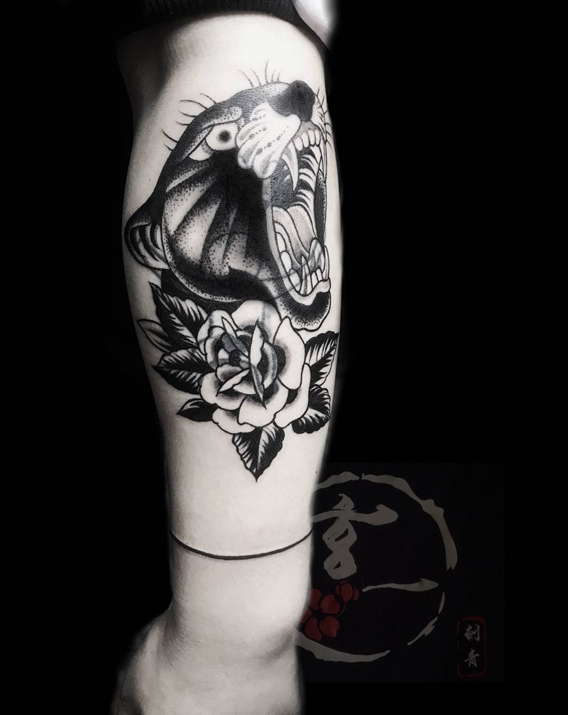 • T网红王老大花腿龙纹身图片_腿部新传统纹身图案