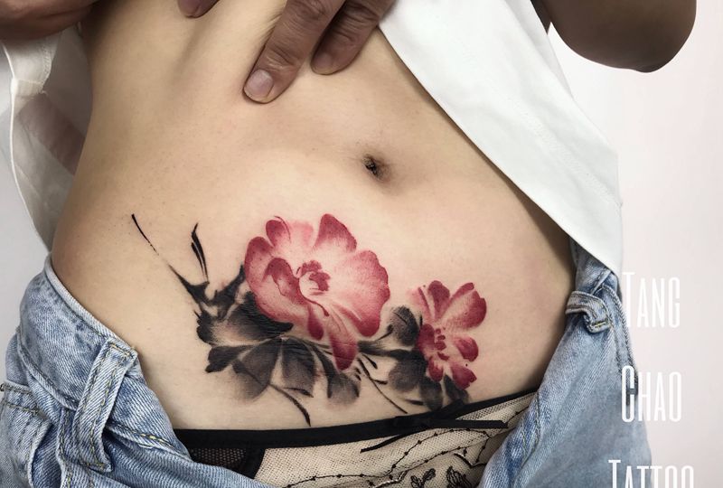 水墨石榴花纹身图片_腹部水墨纹身图案