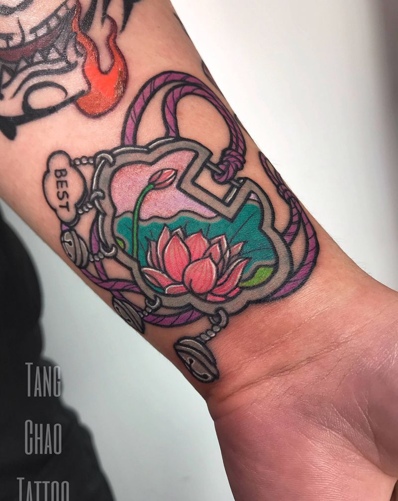 当前位置: 首页 >四川省雅安市纹身店-唐潮刺青纹身图案>荷花平安锁纹身图片_手臂新传统纹身图案