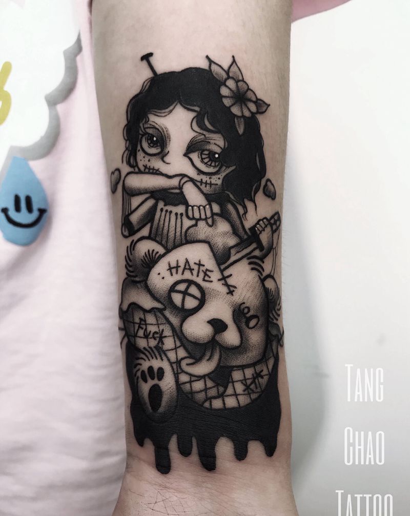 当前位置: 首页 >四川省雅安市纹身店-唐潮刺青纹身图案>提线木偶之粉碎暴力熊纹身图片_手臂Old School纹身图案