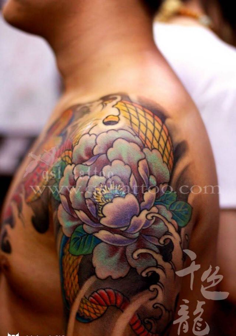 蛇戏牡丹纹身图片