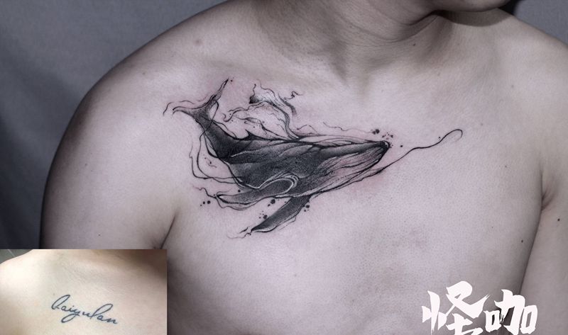 当前位置: 首页 >贵州省贵阳市纹身店-怪咖纹身刺青纹身图案>鲸鱼遮盖纹身图片_手臂胸部水彩水墨纹身图案