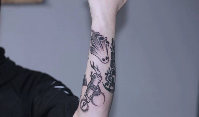 当前位置: 首页 >贵州省贵阳市纹身店-怪咖纹身刺青纹身图案>花臂拼接纹身图片_手臂Old School纹身图案