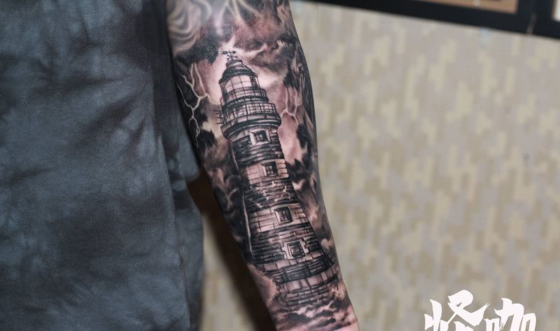 当前位置: 首页 >贵州省贵阳市纹身店-怪咖纹身刺青纹身图案>写实灯塔纹身图片_手臂欧美写实纹身图案