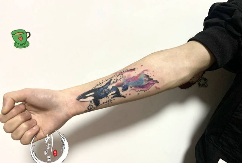 当前位置: 首页 >贵州省贵阳市纹身店-刺客联盟纹身刺青工作室纹身图案>虎鲸纹身图片_手臂水彩纹身图案