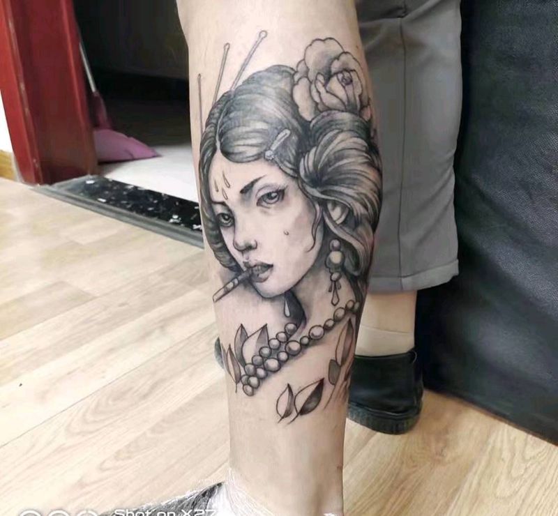 当前位置: 首页 >贵州省贵阳市纹身店-刺客联盟纹身刺青工作室纹身图案>朋克艺伎纹身图片_腿部传统纹身图案