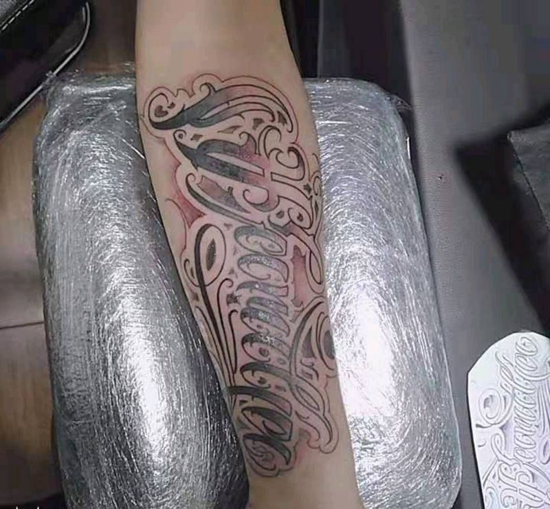当前位置: 首页 >贵州省贵阳市纹身店-刺客联盟纹身刺青工作室纹身图案>奇卡诺花体字纹身图片_手臂花体字纹身图案
