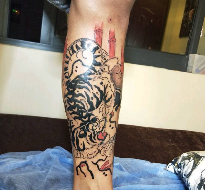 • T网红王老大花腿龙纹身图片_腿部新传统纹身图案