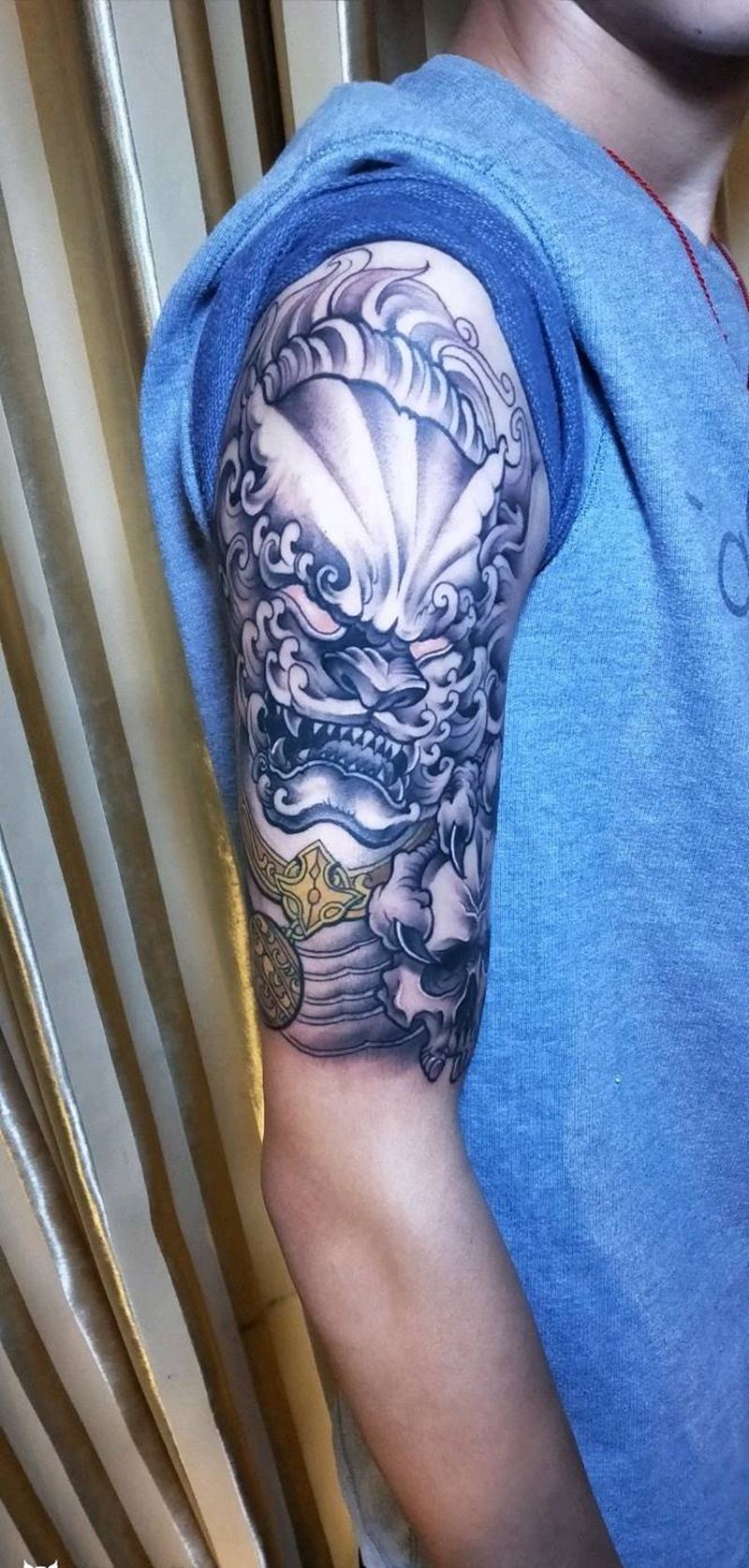 当前位置: 首页 >贵州省贵阳市纹身店-凯宣刺青纹身图案>唐狮纹身图片_手臂新传统纹身图案