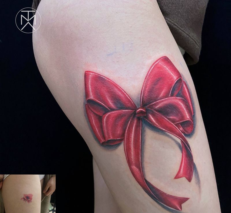 遮盖蝴蝶结纹身图片_腿部脚部欧美写实蝴蝶结遮盖彩色写实纹身图案