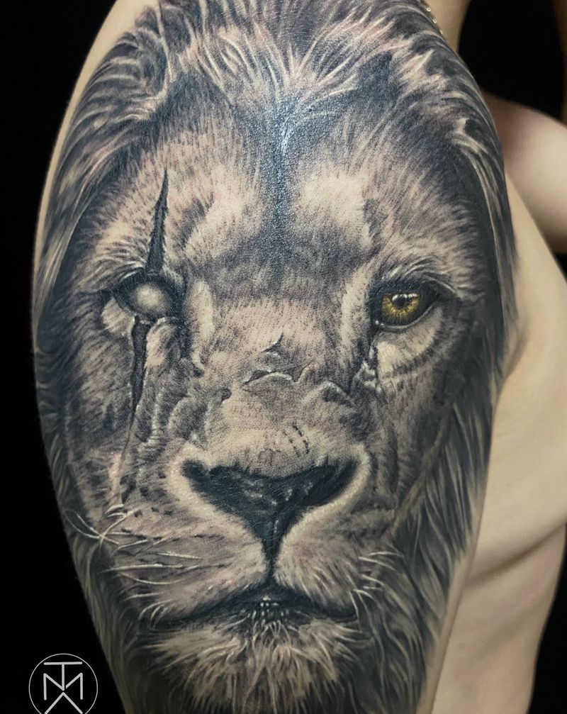 大臂狮子纹身图片_手臂肩部欧美写实狮子动物纹身图案