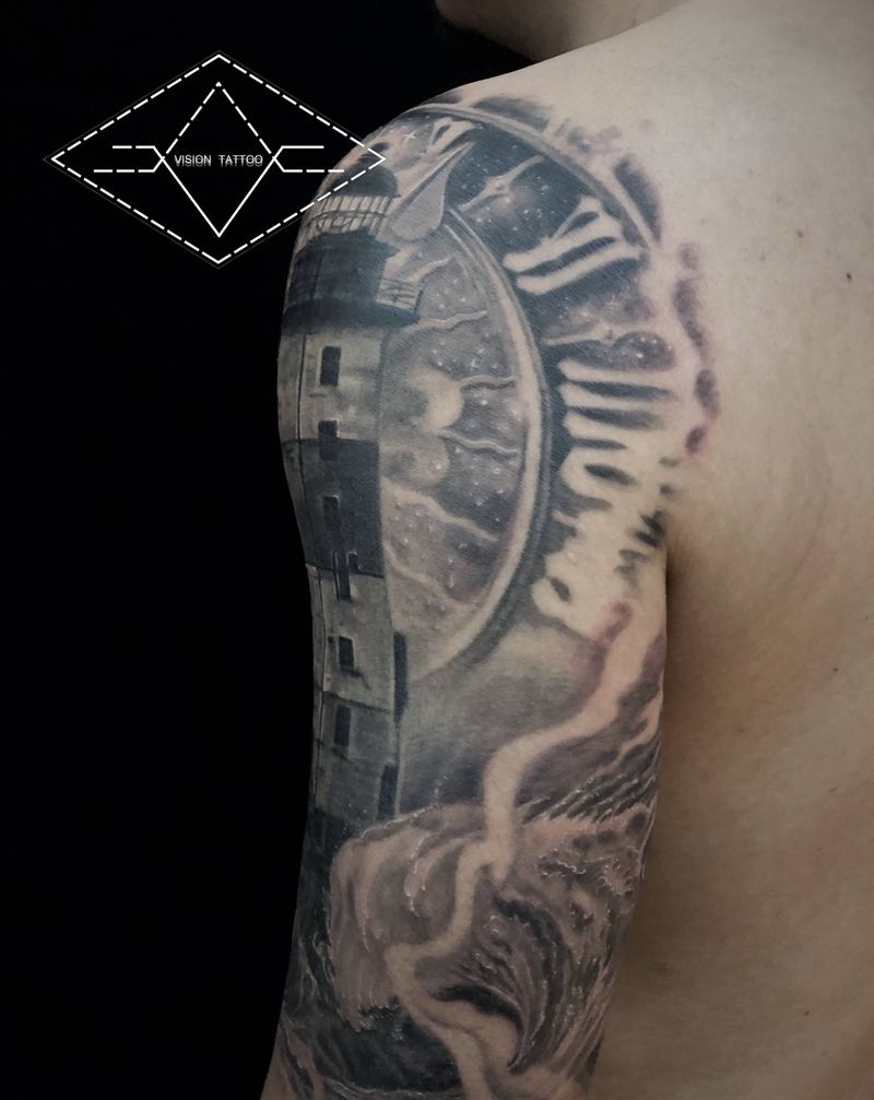 当前位置: 首页 >贵州省贵阳市纹身店-视觉刺青纹身图案>灯塔纹身图片_肩部手臂欧美写实海洋灯塔纹身图案