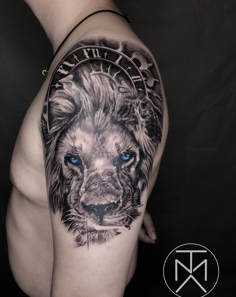 大臂狮子座纹身图片_手部手臂欧美写实星座动物纹身图案