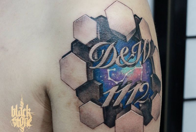 宇宙飞块,花体字纹身图片_手臂欧美写实纹身图案