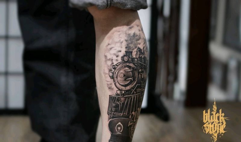 火车驶向云外纹身图片_腿部欧美写实纹身图案
