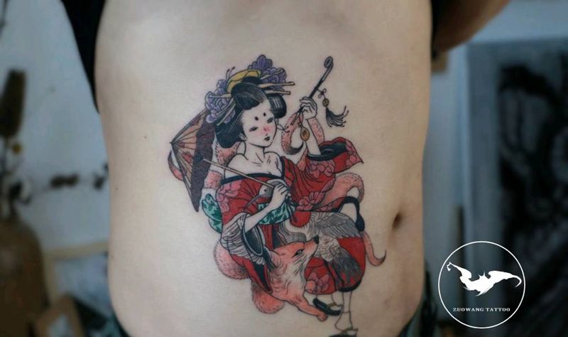 艺伎九尾狐纹身图片_腹部新传统纹身图案