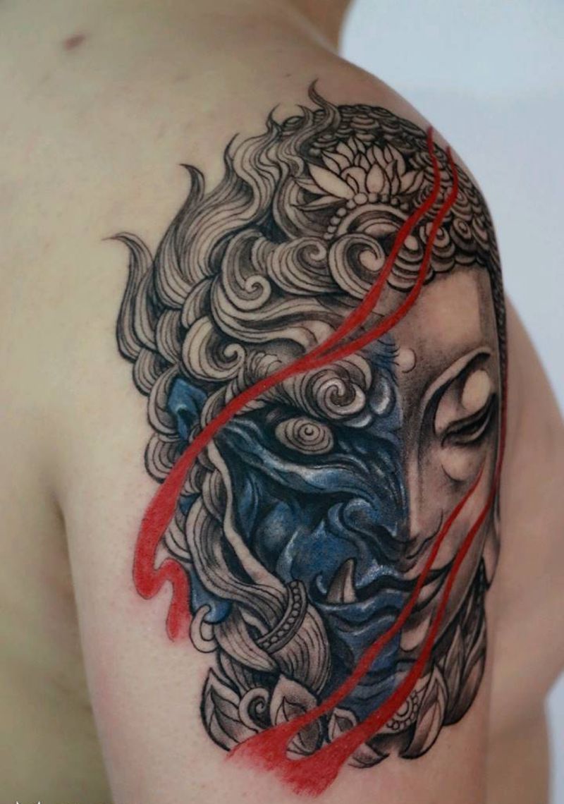 当前位置: 首页 >贵州省贵阳市纹身店-黑石刺青 贵阳店纹身图案>半佛半魔(未完成)纹身图片_手臂新传统纹身图案
