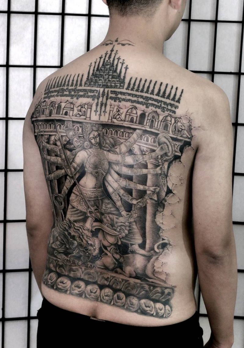 杜尔迦女神纹身图片_背部欧美写实女神杜尔迦纹身图案
