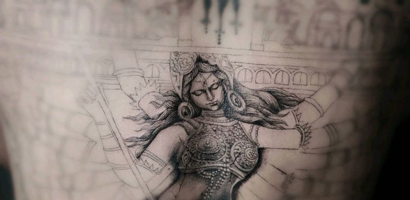 杜尔迦女神纹身图片_背部欧美写实女神杜尔迦纹身图案
