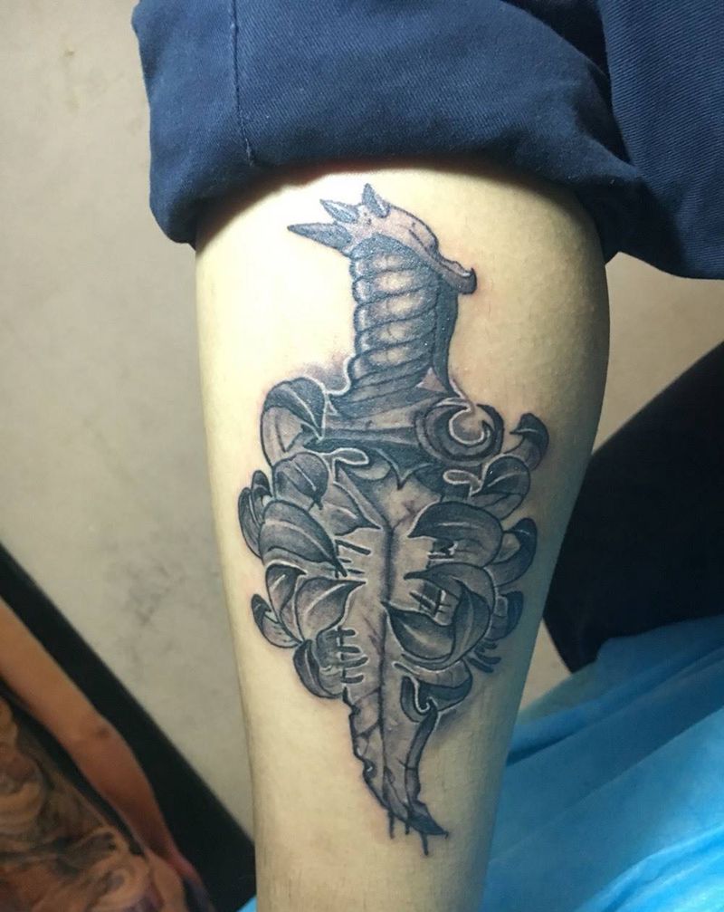 当前位置: 首页 >贵州省贵阳市纹身店-贵阳老街刺青工作室纹身图案>16年的匕首作品纹身图片