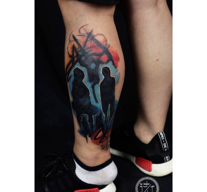 • T包小腿吹火男+阿多福纹身图片_腿部老传统新传统吹火男阿
