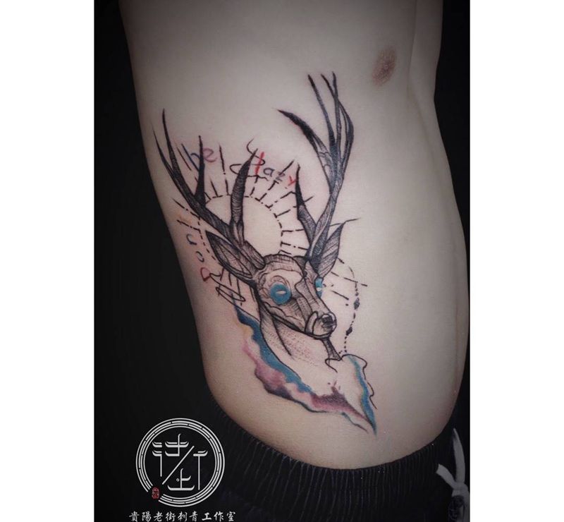 当前位置: 首页 >贵州省贵阳市纹身店-贵阳老街刺青工作室纹身图案>麋鹿纹身图片_腹部水彩点刺麋鹿纹身图案