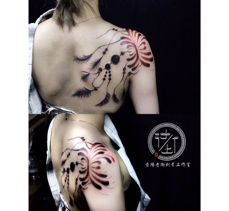 当前位置: 首页 >贵州省贵阳市纹身店-贵阳老街刺青工作室纹身图案>翔子作品,彼岸网。纹身图片_肩部背部水彩彼岸花捕梦网纹身图案