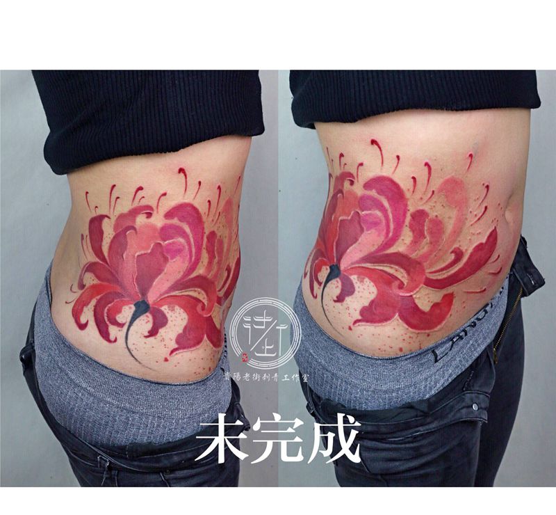 翔子作品,蔓珠莎华遮盖斑斑点点纹身图片_腹部水彩彼岸花蔓珠莎华纹身图案