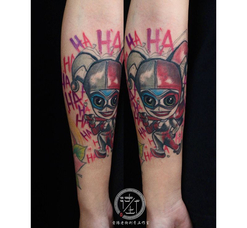 当前位置: 首页 >贵州省贵阳市纹身店-贵阳老街刺青工作室纹身图案>小丑女纹身图片_手臂New School小丑女纹身图案