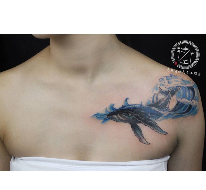 翔子作品,遮盖旧纹身,重生,鲸纹身图片_肩部水彩点刺鲸鱼纹身图案