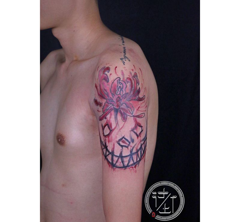 翔子作品,彼岸花和诡异的笑脸。纹身图片_手臂水墨彼岸花纹身图案