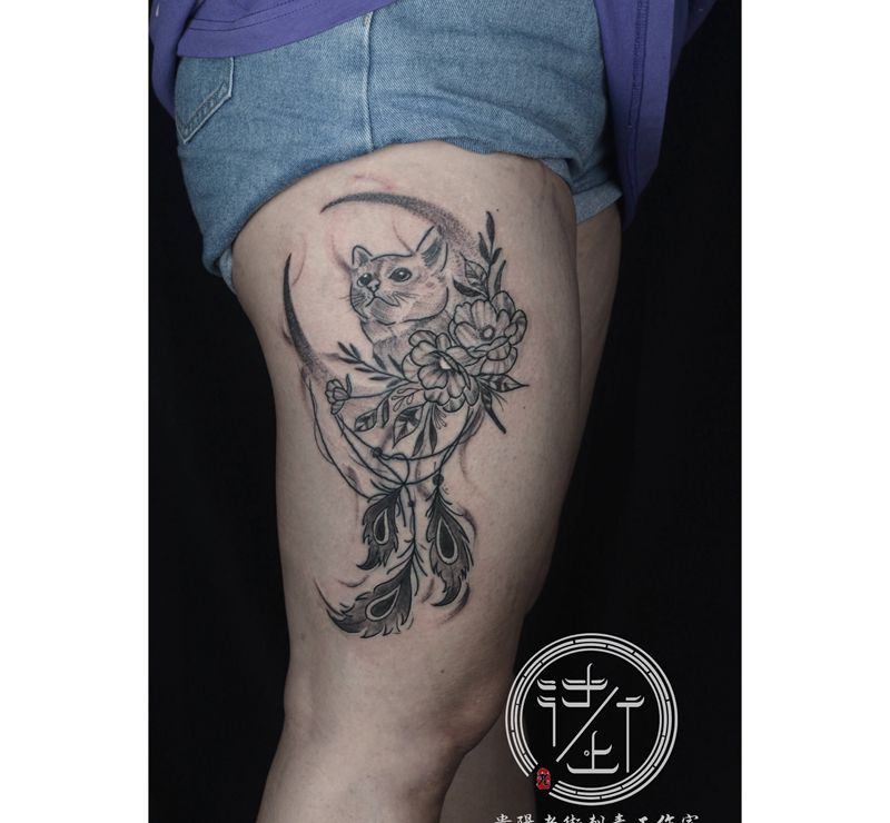 当前位置: 首页 >贵州省贵阳市纹身店-贵阳老街刺青工作室纹身图案>捕梦网纹身图片_腿部点刺图腾捕梦网猫纹身图案