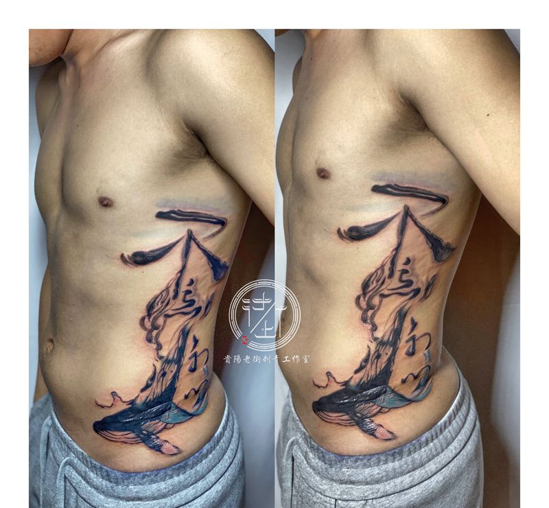 当前位置: 首页 >贵州省贵阳市纹身店-贵阳老街刺青工作室纹身图案>鲸鱼纹身纹身图片_腰部腹部水墨鲸鱼遮盖纹身图案