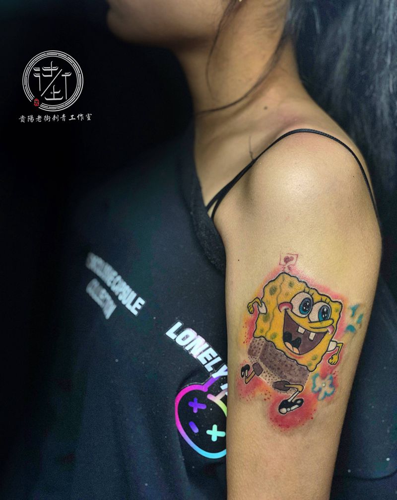 当前位置: 首页 >贵州省贵阳市纹身店-贵阳老街刺青工作室纹身图案>海绵宝宝纹身图片_手臂水彩海绵宝宝纹身图案