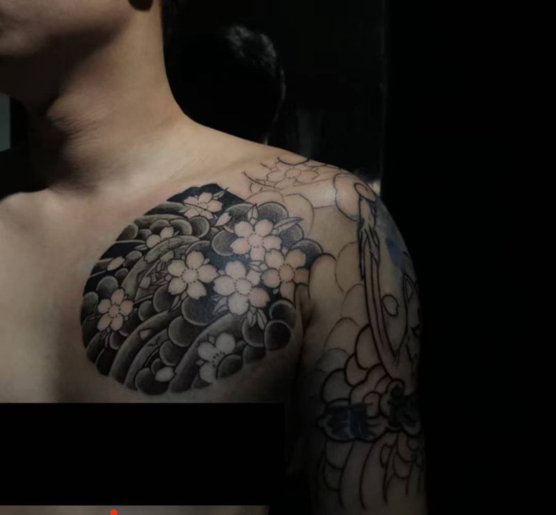 半甲定制纹身图片_胸部老传统樱花纹身图案