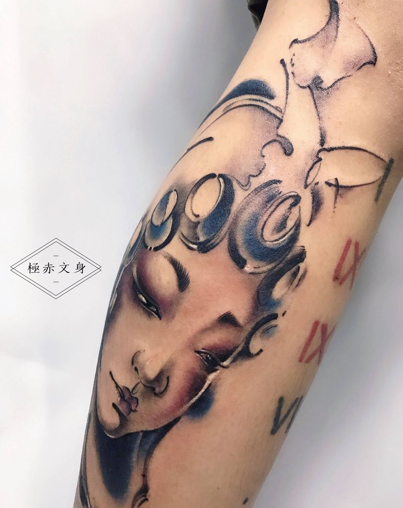 当前位置: 首页 >贵州省贵阳市纹身店-極赤文身纹身图案>水墨花旦纹身图片_腿部水墨花旦水墨纹身图案
