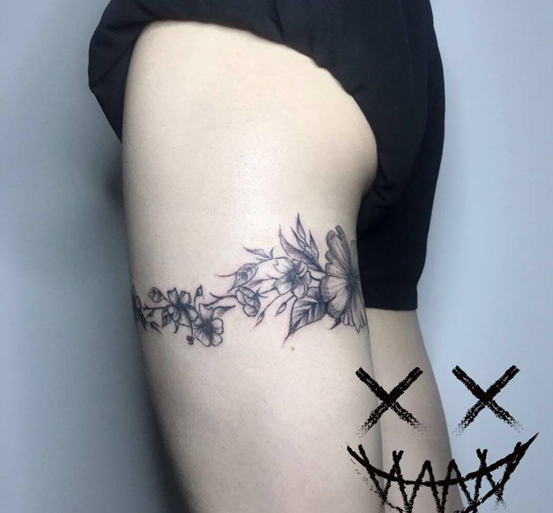 素花腿环纹身图片_腿部点刺素花腿环纹身图案