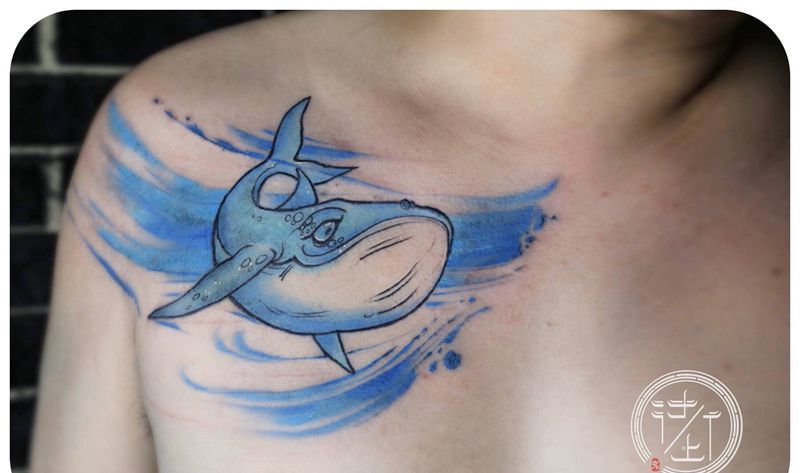 看海天一色 听风起雨落纹身图片_胸部水彩鲸鱼无上水彩纹身图案