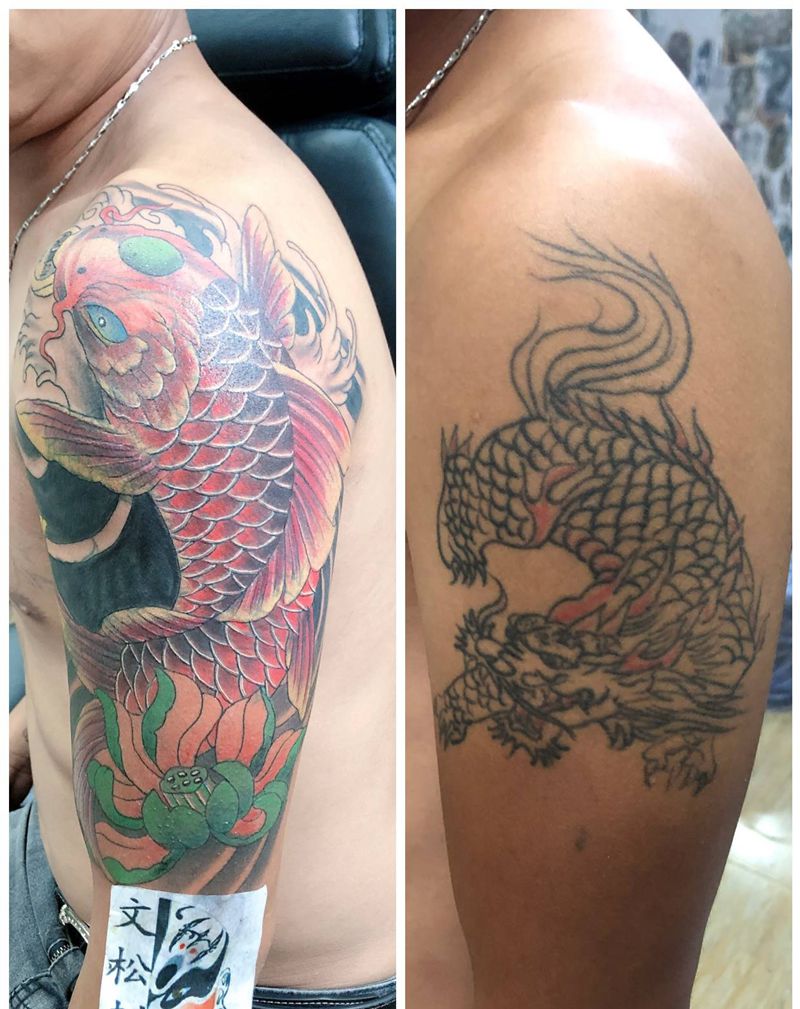 • T网红王老大花腿龙纹身图片_腿部新传统纹身图案