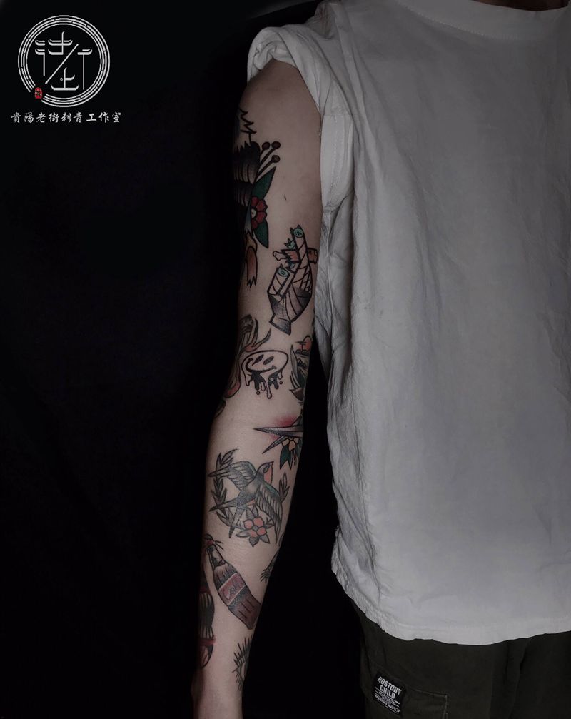当前位置: 首页 >贵州省贵阳市纹身店-贵阳老街刺青工作室纹身图案>Oldschool拼接花臂纹身图片_手臂手部Old School拼接花臂纹身图案