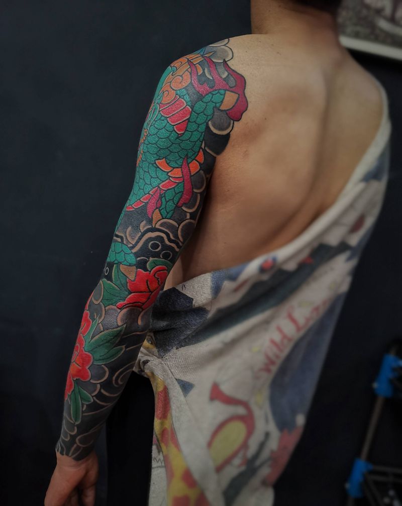 • T网红王老大花腿龙纹身图片_腿部新传统纹身图案