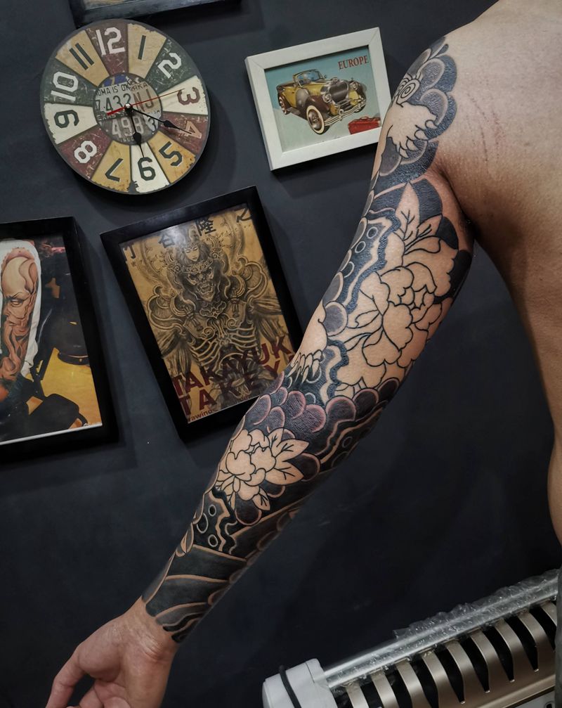 当前位置: 首页 >贵州省贵阳市纹身店-贵阳魔魂刺青纹身图案>老传统花臂未完成,满背不是本店纹身图片_老传统纹身图案