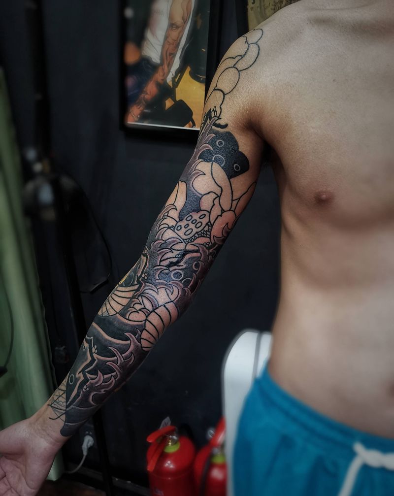 当前位置: 首页 >贵州省贵阳市纹身店-贵阳魔魂刺青纹身图案>老传统花臂遮盖失败艺伎未完成纹身图片_老传统纹身图案